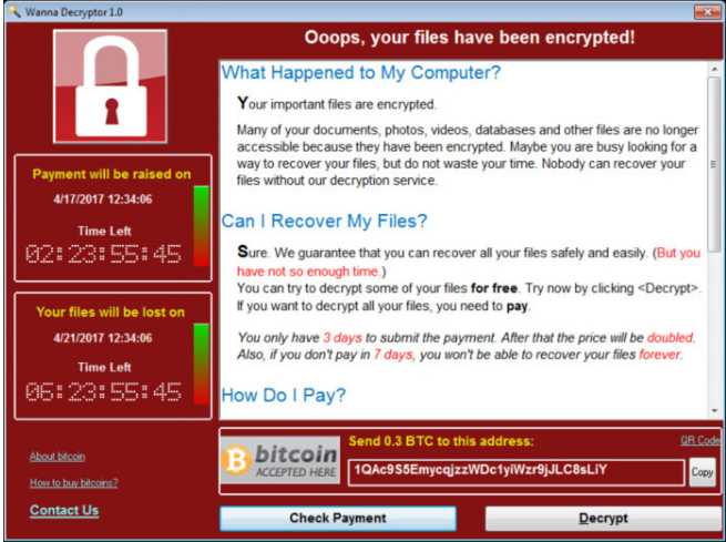 Le virus concerné serait Wanna Decryptor (autres noms : Jaff, Wana, wCry,) qui semble exploiter une vulnérabilité corrigée par le correctif Microsoft MS17-010.