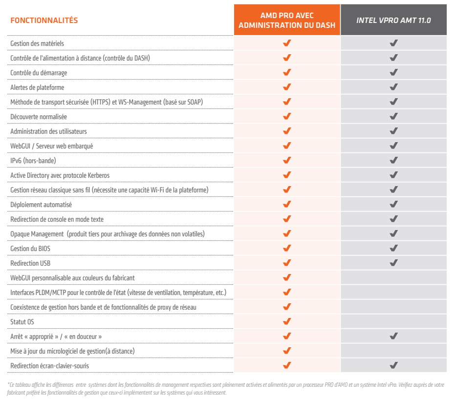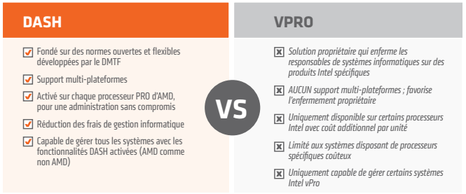 Cependant l’offre Intel AMT vPro nécessite d’utiliser la gamme “corporate” des processeurs ( validé AMT vPro) plus coûteux et présent généralement uniquement sur les gammes supérieures des constructeurs. La technologie DASH équivalente est présente sur toute la gamme Pro notamment Ryzen Pro.