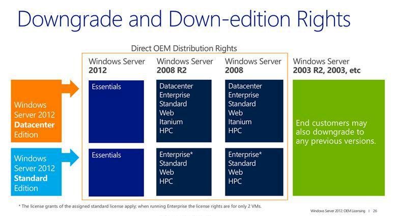 Dans le processus de rétrogradation (Downgrade) de Windows Server 2012 ROK, on peut rétrograder la licence 2012 vers 2008 / 2008 R2 pour utilisation directement sur le serveur physique ou uniquement dans les machines virtuelles (le serveur hôte reste en 2012)