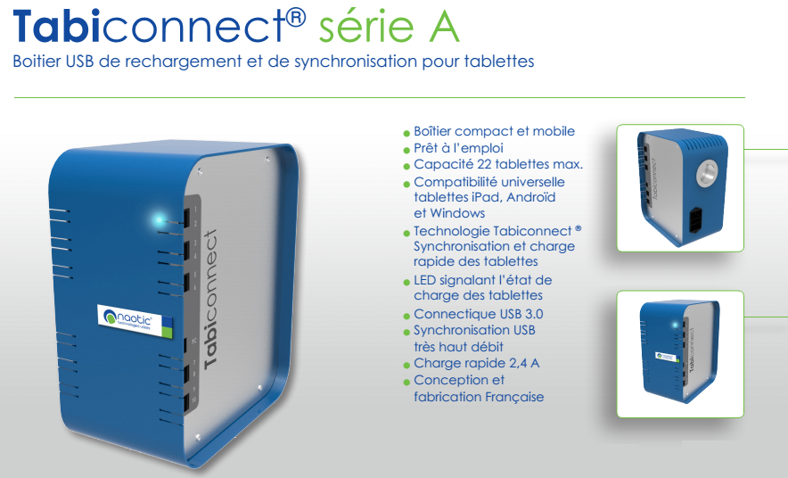 Gamme Tabibox et Tabiconnect : solutions autonomes permettant le rechargement centralisé et sécurisé de tablettes, avec ou sans la synchronisation (selon produit). Technologie française (marque déposée Naotic) intégrant les évolutions des matériels informatiques (notamment USB 3.0 et norme USB charging spec. 1.2) et compatible avec tout OS ou toute marque de tablettes (si respect de la norme ci-dessus). La solution Tabiconnect existe en version boîtier autonome ou intégré. L’armoire murale Tabibox existe en version rechargement centralisé uniquement ou avec également la fonction synchronisation.