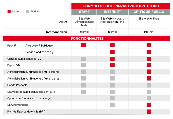 Il existe 3 formules de Cloud public (Start, Internet, Critique) vous permettant de bénéficier de différents types de service correspondant à vos besoins ou vos usages