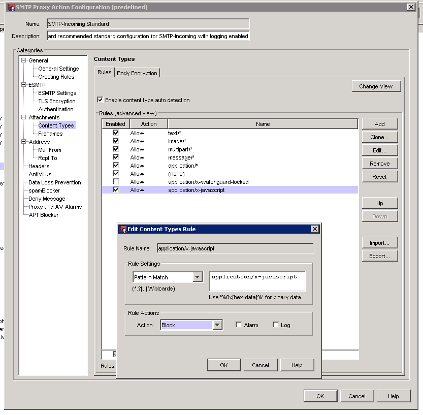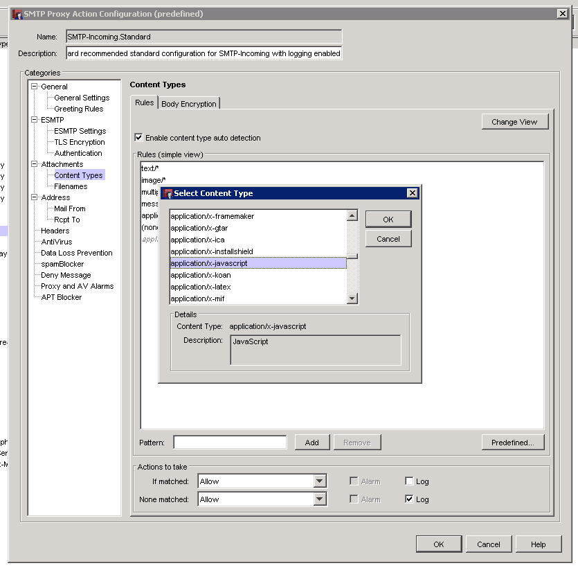 3. Cliquer sur « Change View » puis double cliquer sur « application/x-javascript » et passer l’action à « block ». Cette fonctionnalité de scan du contenu dans un fichier zip, n’est disponible que depuis la version 11.10.4